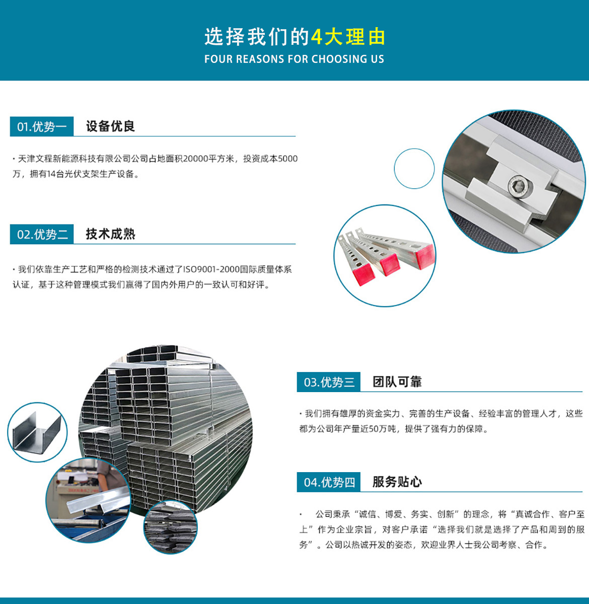 關(guān)于我們天津文程新能源科技有限公司成立于2021年,是專注于集中式、分布式、漁光互補(bǔ)和農(nóng)光互補(bǔ)等清潔能源發(fā)電的綜合性企業(yè) 公司是集設(shè)計(jì)、研發(fā)、生產(chǎn)、制造為一體的綜合型企業(yè)。公司占地面積20000平方米,注冊(cè)資金5000萬(wàn)元整。公司坐落于華北鋼鐵重鎮(zhèn)--大邱莊,距天津市區(qū)50公里、鄰104和205國(guó)道及京滬高速,交通十分便捷。 本公司擁有三個(gè)生產(chǎn)車間,其中兩個(gè)冷彎型鋼車間,一個(gè)鋅鋁鎂型鋼車間,擁有自動(dòng)冷彎成型機(jī)10條,自動(dòng)數(shù)控沖孔機(jī)10條以及焊接加工等設(shè)備。主要生產(chǎn)產(chǎn)品有:太陽(yáng)能光伏支架、各種規(guī)格的C/Z/U型鋼、抗震支架、管廊支架及整套配件等。
